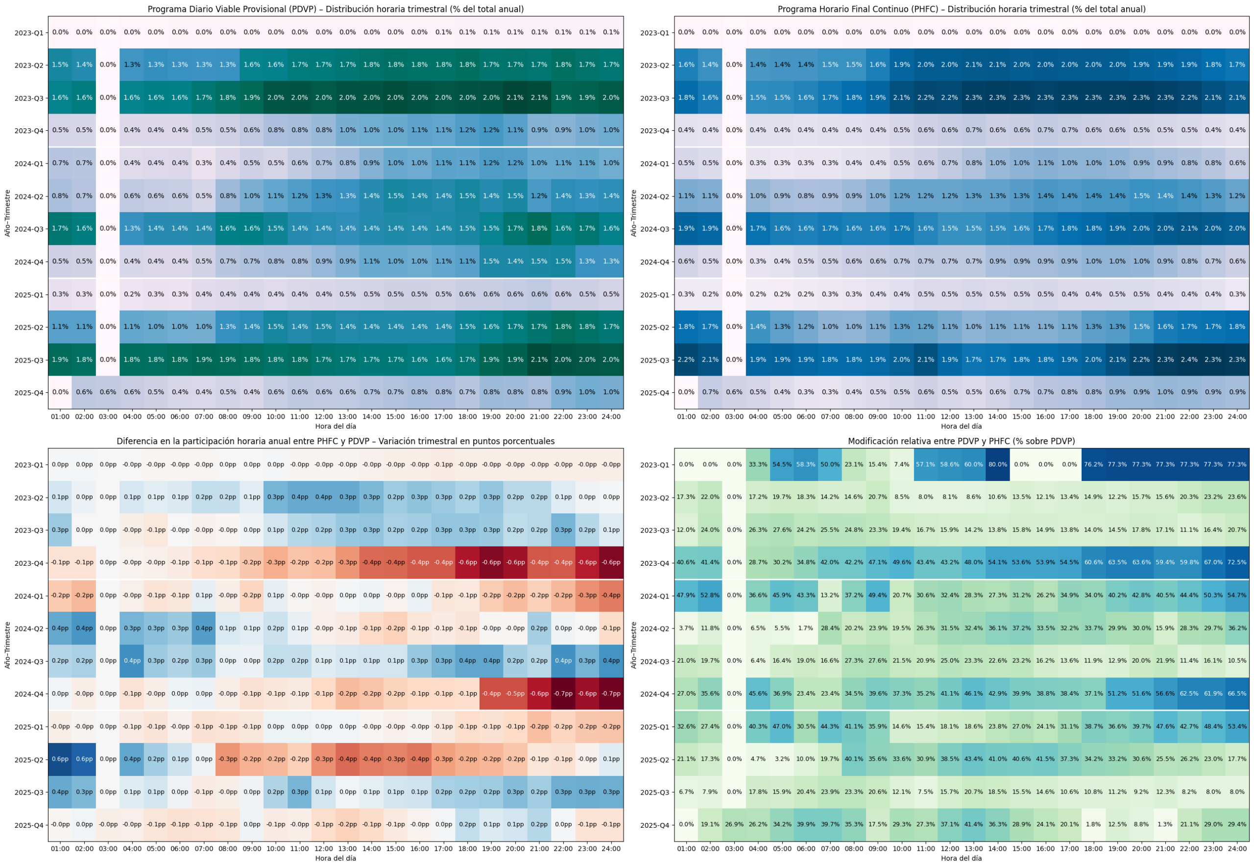 En la parte superior de la imagen se muestra , para cada hora del día, la distribución horaria de la energía programada de la planta termosolar, expresada como porcentaje del total anual en PDVP y PHFC, desagregada por trimestres para el período 2023-2025. Los resultados muestran que la estructura horaria del PHFC no es una réplica exacta del PDVP. Aunque comparten una base común, aparecen desplazamientos sistemáticos de participación entre determinadas franjas horarias que se repiten a lo largo de los años incluidos en el análisis. En algunos trimestres se refuerzan las horas centrales y vespertinas en el programa final, asociado a procesos de reprogramación intradiaria motivados por la actualización de las condiciones operativas y del recurso disponible.
