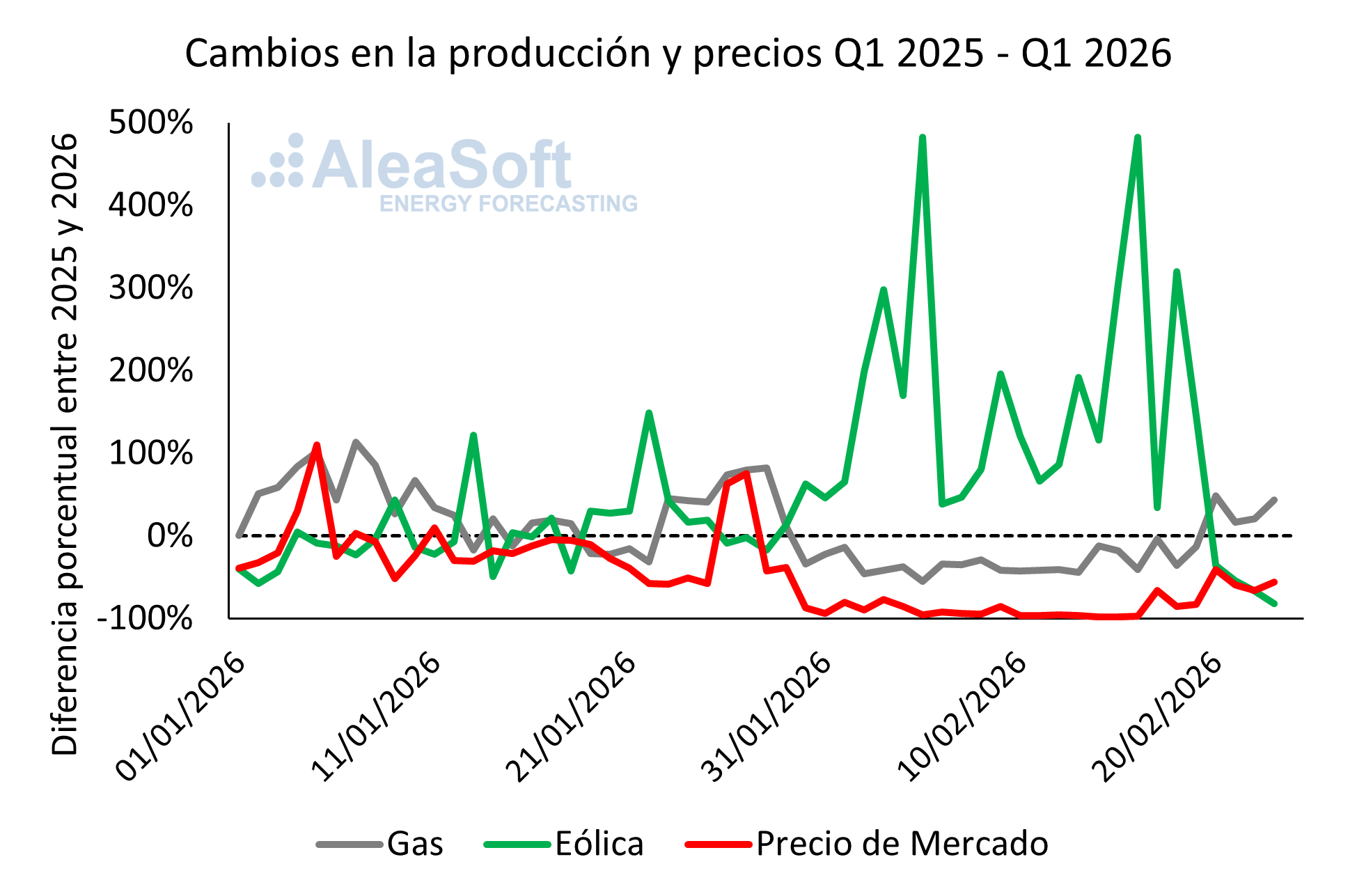 Debido en parte a las importantes tormentas de este inicio de año (10 borrascas de gran impacto según la AEMET), se ha visto un notable aumento en la generación de renovables. Particularmente la producción eólica ha aumentado un 65 % respecto a 2025 y la producción hidráulica también ha subido un 7,5 %, considerando datos de producción entre el 1 de enero y el 24 de febrero.