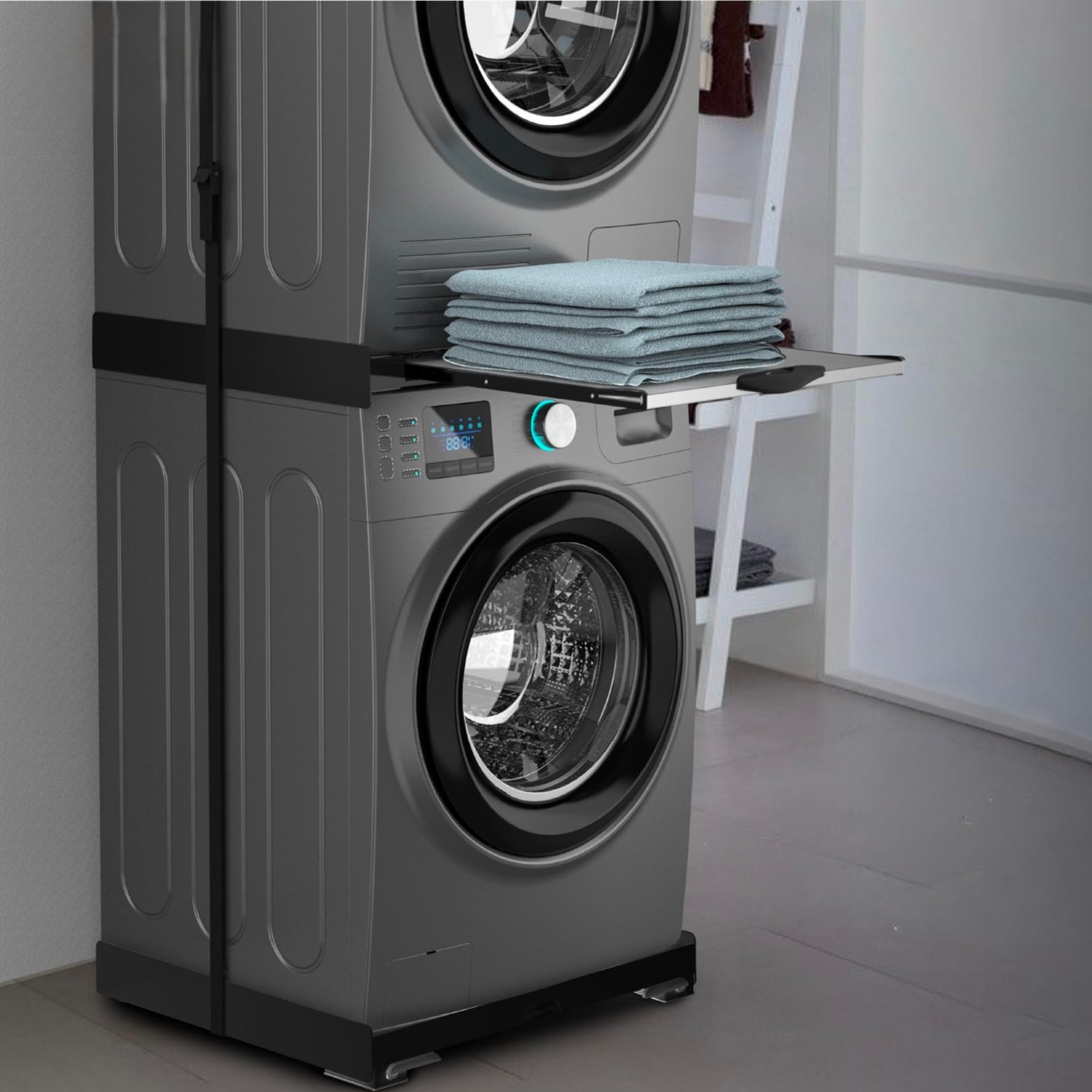 - Kits de superposición, que permiten colocar lavadora y secadora en vertical, liberando espacio útil.