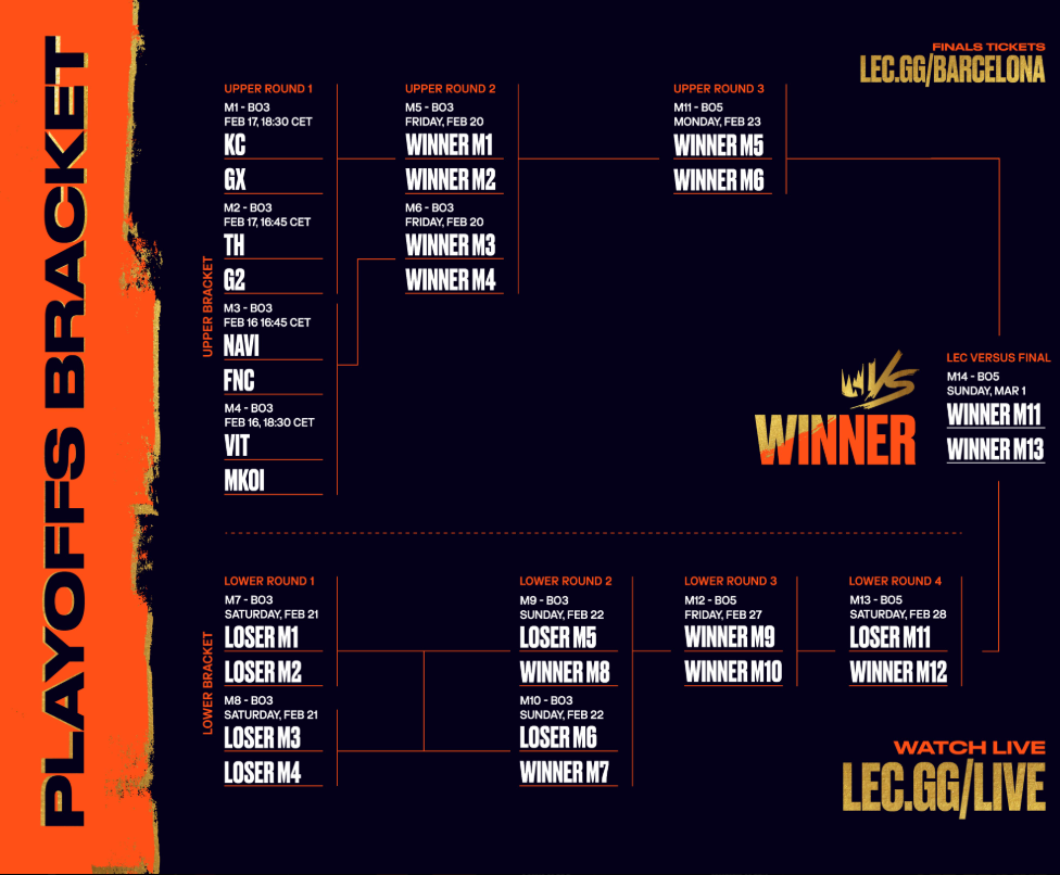 Los tres conjuntos españoles de la competición estarán en la fase eliminatoria después de una fase regular muy disputada. Los equipos nacionales se jugarán el paso la siguiente eliminatoria contra Karmine Corp, Natus Vincere, Team Vitality, G2 Esports y Fnatic. Las primeras rondas de playoffs tendrán lugar en Berlín del 16 al 23 de febrero